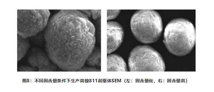 從上圖可以看出高固含量下制備得到高鎳前驅(qū)體,顆粒致密性好,球形度更好,粒度分布更為集中,一次粒子晶界模糊。